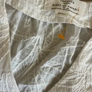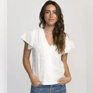 NWT Trovata Angela Flutter Sleeve Blouse in White Embroidery is the perfect fun flirty blouse to wear from day time to night time. The blouse has a V-Neck and short flutter sleeves. The blouse has beautiful white embroidery in the shape of leaves through out the design.