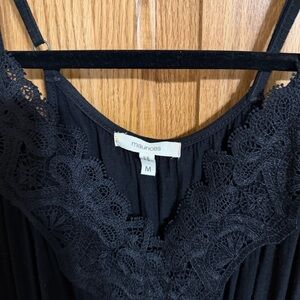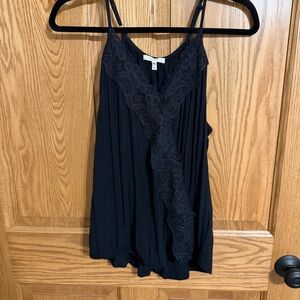 Chic black camisole featuring elegant lace accents. Perfect for layering or wearing alone.