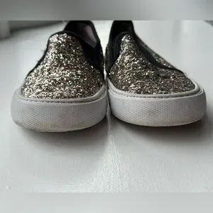 Glitter slip on sneakers from Cat & Jack. Girls size 2. Silver glitter slip on sneakers with black trim and white rubber soles. Good used condition.
