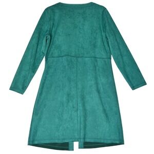 Keywords: suede cardigan, duster, teal, long sleeve, open front, patch pockets, women's fashion, versatile, casual chic, layering piece, modern, minimalist