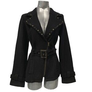 A Giannetti Black 100% Wool Knit Studded Collar Belted Moto Jacket Womens sz M