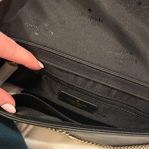 Chic black leather crossbody with chain accent. Ideal for day or night. Brand new