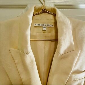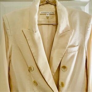 Stunning and sophisticated Veronica Beard blazer in a gorgeous cream/ivory shade. This beautifully tailored piece features signature Veronica Beard structure with strong shoulders, sharp lapels, and luxe horn-style buttons. Made in the USA with impeccable craftsmanship, this blazer instantly elevates any outfit — from workwear to special events to chic everyday looks.