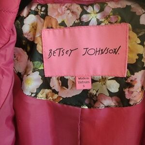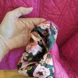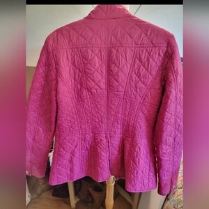 Stylish pink quilted jacket. Floral lining adds charm. Perfect for cool weather.