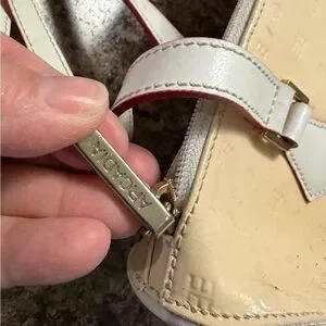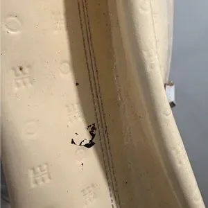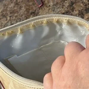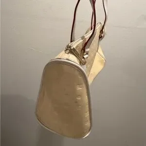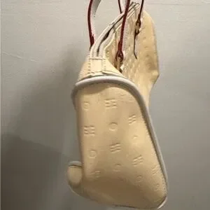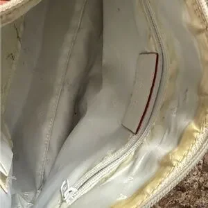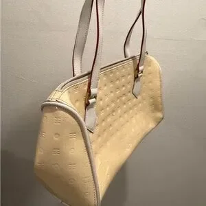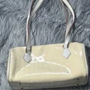 This elegant cream handbag is perfect for any occasion. Its sleek design and neutral color make it a versatile addition to your wardrobe. Preowned with beginning signs of discoloration mainly on interior lining.