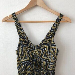 A silk A.L.C. dress in a vibrant ikat print. The asymmetrical, accordion-pleated skirt creates a dramatic, swingy shape. Wide straps. Hidden side zip. Lined.
