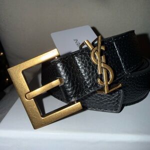 Elegant black leather belt featuring a striking gold YSL logo. Ideal for adding a touch of luxury.