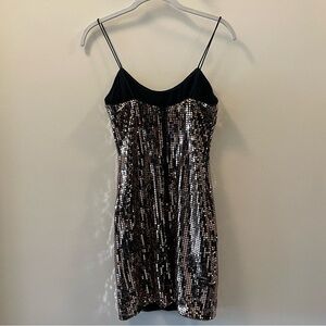This stunning spaghetti strap embellished mini dress is perfect for any party or NYE look! Size 4 and tacking at the shoulder for the shorter girls - easily removable! This beauty includes a scoop neck, flattering fit, mini length and sparkly embellishments throughout. Message with any questions!