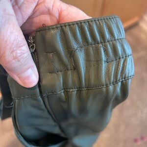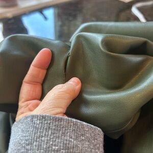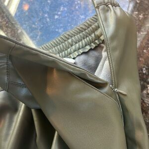 These pants are flattering and fun! Vegan leather. Pockets. Elastic waist and zipper. The faux leather is in excellent condition. There are a few spots where the stitches are missing. See pics. This includes waist band and crotch area. This does not affect wear. Beautiful olive green color.