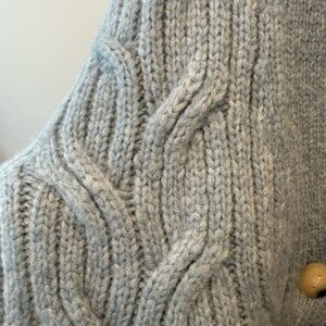 Elegant cable knit cardigan by Vince. Features a soft blue hue. Ideal for layering.