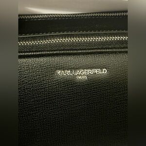 Elegant black bag crafted with a refined textured finish, adorned with a sleek silver Karl Lagerfeld logo.