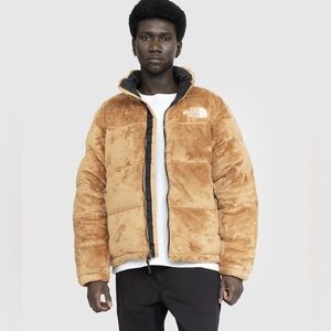 Cozy and stylish The North Face puffer jacket. Ideal for cold weather. Features a plush design. Made in a velour almond butter color. Comes with a front zipper closure, side pockets, an inside pocket and an elastic on the inside to adjust jacket at the hem. It’s technically a Men’s size small, but I bought it to use on myself and it fits pretty cool as a unisex option. I only used it once, it’s fresh out of the dry cleaner and in great condition!