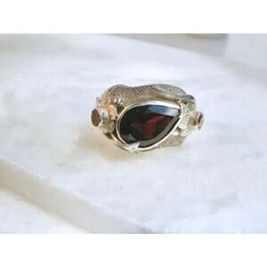 Gorgeous hand carved sterling silver flower and vines set with a large deep red tear shape faceted garnet flanked by two deep golden orange grossular garnets. Heavy hand forged one of a kind sterling 925 silver.