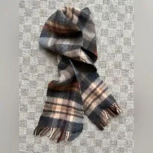 Beautiful plaid vintage 100% wool scarf from Ireland. Colors are a blend of gray, brown, and cream tones, accented with orange, mustard, and a pretty berry color. Very good vintage condition.