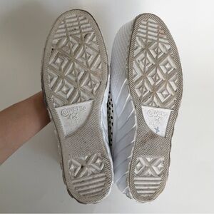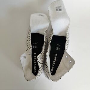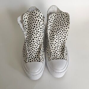 Converse high tops in an ivory white “egret” color with black pebble polka dots. “Welcome to the wild” version of the 2x lift platform shoes. Thick platform bottom sole. Some scuffs but overall very good condition, no stains on the canvas top. Missing shoelaces