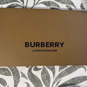 Elegant Burberry scarf with box. Features bold black logo. Ideal for gifting.