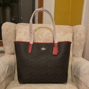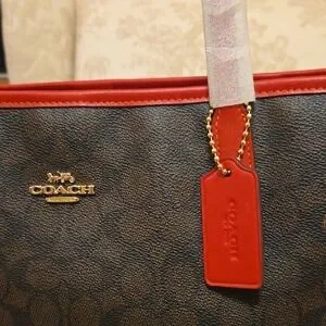 Elegant Coach monogram tote in dark brown with bold red details. Features signature logo and spacious interior.