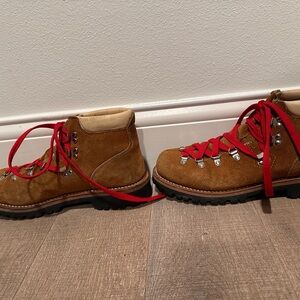 Rare BTG 1980s Montblanc boots in tan suede. Bold red laces. Rugged sole for traction. Mountaineering boots. Unisex #vintage #trending #fashion #fireside #footwear