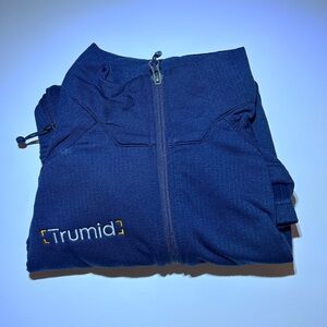Experience comfort and style with this dark blue utility jacket. Features a sleek design and practical pockets. Ideal for outdoor adventures. Company branded. Unworn. Washed.