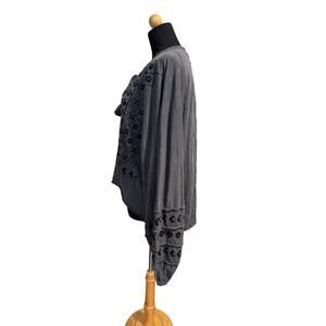 Chic gray blouse with intricate black embroidery. Features long sleeves and tassel details. Perfect for casual wear.worn 2x