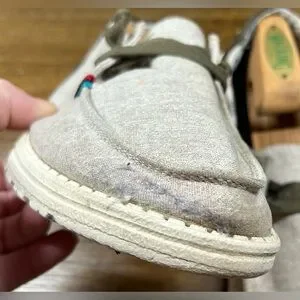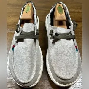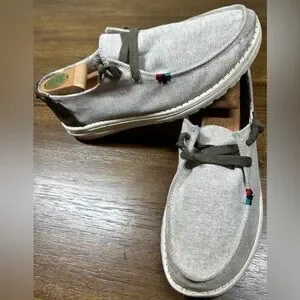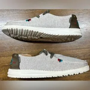 The Hey Dude Women’s Size 8 Wendy Rodeo Wheat Aztec Slip On Loafers are casual shoes perfect for travel, activewear, casual outings, and workwear. These slip-on loafers feature a round toe, flat heel, and are made of lightweight and breathable canvas fabric with Aztec accents. They offer comfort and cushioning with a foam insole, making them ideal for walking and everyday wear. The shoes also have a low-top shoe shaft style in a light gray color, making them versatile for all seasons. Made with synthetic outsole material, these loafers are a stylish and practical choice for women looking for comfortable footwear.