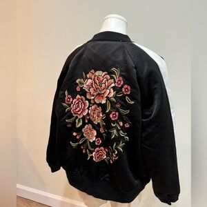 Forever 21 Black Bomber Jacket with Pink Floral Embroidery