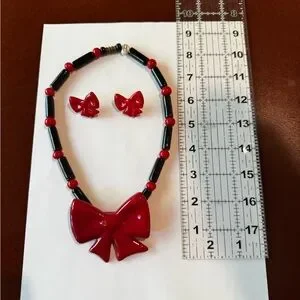 This stunning jewelry set features a bold red and black design, perfect for adding a touch of elegance to any outfit. The set includes a necklace and matching earrings, each adorned with a charming bow detail. Ideal for special occasions or everyday wear.
