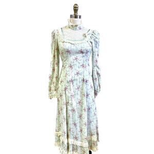 A stunning example of the romantic prairie aesthetic, this vintage 1970s dress captures the charm of the Victorian revival period. Reminiscent of the iconic Gunne Sax designs, it features a pale green sheer gauzy voile with a delicate pink floral mini print. The exquisite details include a bib yoke with lace and self-ties, elegant puffed sleeves, and a full, flowing silhouette. In excellent condition, with one small stain on the back that speaks to its authentic journey, this handmade garment is a truly unique find. By choosing this pre-owned piece, you embrace a sustainable lifestyle and a timeless, romantic look.
