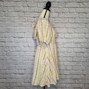 Mable Dress Babydoll White Pastel Plaid Square Neck Puff Sleeves Tie Back Size M