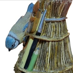 Petite piece measures approx. 3" tall and is sculpted as a straw / reed sheaf tied with twine. Tiny pencils and paintbrushes wrap around the bundle, with a Bastin-style songbird clinging to the side. The yellow pencil is marked with her “MB” initials.