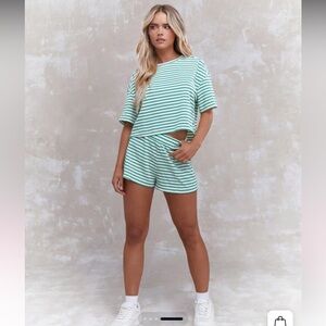 MISSGUIDED Women Casual Stripe Knit Short Sleeve Two Piece Outfit. Ribbed texture. Perfect for wearing together or each piece individually.