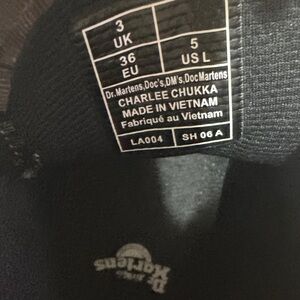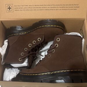Classic dark brown boots with sturdy design. Dr. Martens charlee chukka leather boots. This style runs big. They are a size 3 which fits a women’s size 6 in any other shoe.