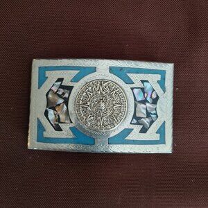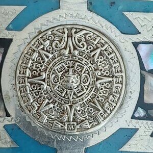Vintage Aztec sun dial belt buckle featuring intricate silver detailing and blue accents. The rectangular buckle features a central circular design.