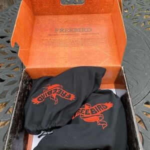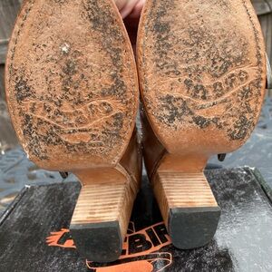 Chic Freebird boots with a stylish tan and black design. Features bold buckle accents and a sturdy heel. Perfect for elevating any look.