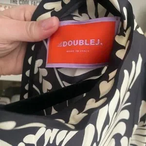 STUNNING Italian silk twill maxi dress from Milanese label LA Double J. Features a striking navy and ivory geometric pattern on the upper portion, transitioning into a flowing skirt with organic leaf motifs. Cut with a mock neck and 3/4 length dolman sleeves, making it perfect for a wedding guest or cocktail occasion. A-line, flowy silhouette fits from size 6 to 12.