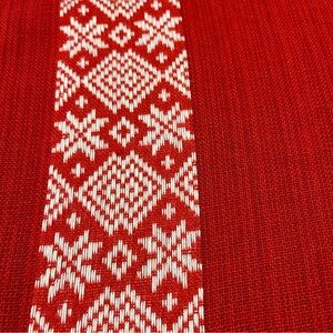 Preowned holiday tablecloth. Enhance your dining experience with this elegant red and white patterned tablecloth. Looks like snowflakes so would be a colorful holiday or winter tablecloth. Kinda has a Scandinavian/Swedish style. Perfect for adding a touch of sophistication to any meal. There’s no tags on it but I usually was in cold and dry on low. Nice mid weight feel. Rectangular measures approximately 54” wide and 92” Long.