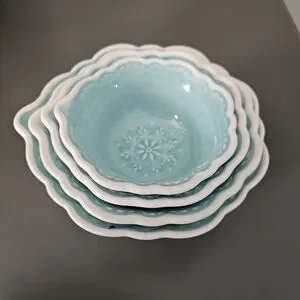 Set of Four scalloped Measuring Bowls. Light blue interior with white edges. Elegant Lace design.