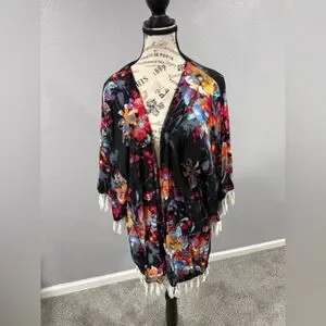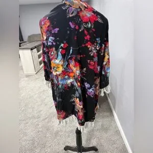 Add a bold pop of color to any outfit with this gorgeous Umgee kimono. Featuring a vibrant multicolor floral print on a black background, this lightweight layering piece is perfect for year-round styling. The open-front design and soft drape make it flattering on all body types, while the white tassel trim adds the perfect boho touch.