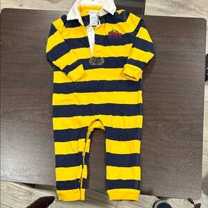 Ralph Lauren rugby one piece in size 12M. Features classic yellow and navy stripes, a white polo collar, embroidered logo on the chest, and button front closure. Snaps at the inseam for easy diaper changes. Soft 100% cotton fabric, perfect for everyday wear, playtime, and photos. Good preowned condition.