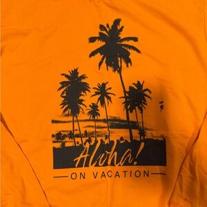 Bright orange hoodie featuring a black palm tree design and 'Aloha! On Vacation' text. Perfect for casual wear.
