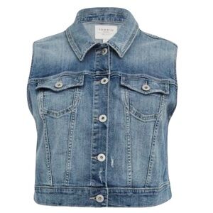 Chic light blue denim vest. Sleeveless with button closure. Ideal for layering.
