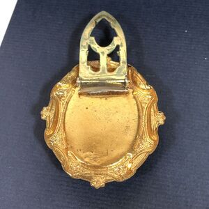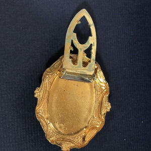 Oval shaped with decorative brass or gold tone metal frame.