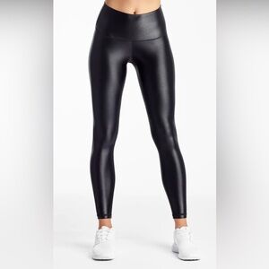 Experience the perfect blend of style and comfort with these DYI black leggings, featuring a high-rise waistband and a sleek, glossy finish. Crafted from a stretchy, form-fitting fabric, they offer a seamless look ideal for both fashion-forward and athletic occasions. These full-length leggings are a versatile addition to any wardrobe, providing a chic and minimalist aesthetic.