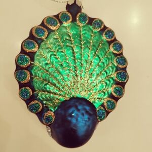 Blown glass gorgeous peacock Christmas tree ornament with glitter. Only flaw is some flaking in the paint as seen in the picture.