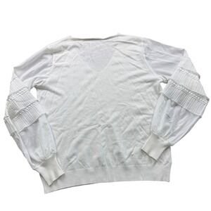 Keywords: Sioni Milano sweater, white sweater, long sleeve sweater, pleated sleeve sweater, V-neck sweater, women's sweater, ribbed knit sweater, elegant sweater, casual sweater, designer sweater, comfortable sweater, rayon blend sweater, dressy casual sweater