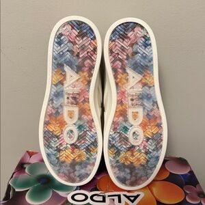Brand new and unworn Women’s Low Top Aldo Sneakers, Size 5 which is sold out on Aldo’s website. Color is “natural” which is more like an off-white. Features bright-colored flower charms across faux-leather uppers with cloud-soft padding cushions. Lace closure and closed round toe. Comes with original shoe box that’s beat up from shipping. Also comes with a pack of stickers.