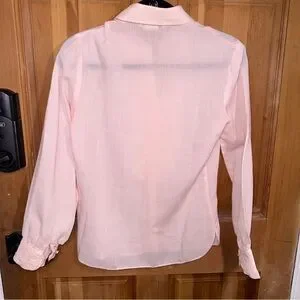 This delicate blush-pink blouse features a ruffled bib front, button closure, and lightweight sheer fabric perfect for layering. The subtle balloon sleeve with button cuff adds an elevated, timeless silhouette.