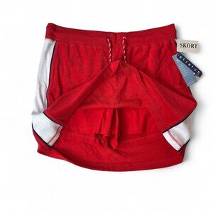 red and white, mini skirt, stretchy, built-in shorts, preppy style, brand new, versatile fit, casual wear, athletic-inspired