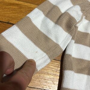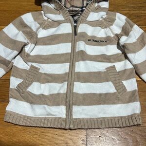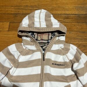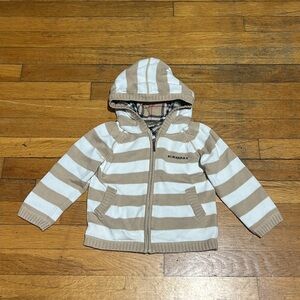 Stylish Burberry hoodie with tan and white stripes. Features a cozy hood and front pockets. Perfect for casual wear.