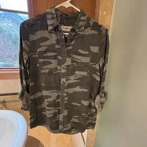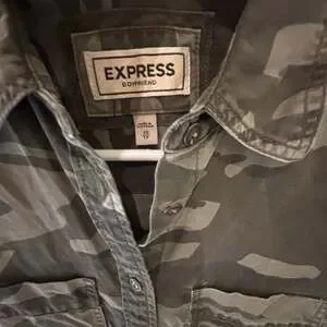 Express Camouflage Military Boyfriend Button Down Shirt, women's size XS. This stylish button-down features a classic boyfriend fit and a military-inspired camouflage print in shades of green and grey. Perfect for a casual look or layering. Excellent pre-owned condition with no visible flaws. The design includes front flap pockets and roll-up sleeve tabs for versatile wear. An essential for any casual wardrobe seeking a touch of edgy style.